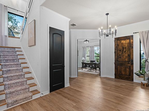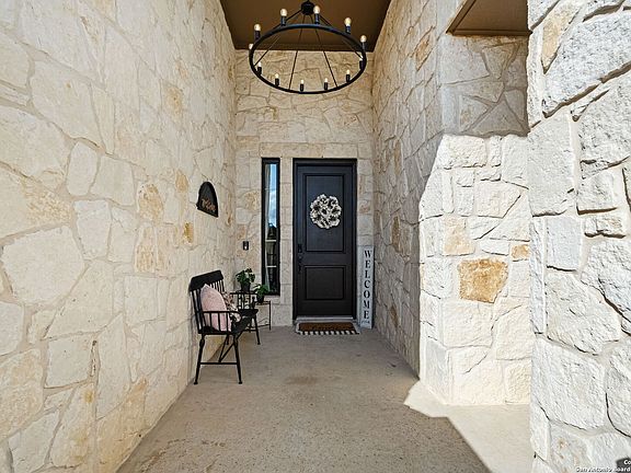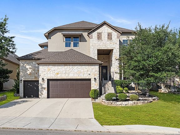 This stunning 4-bedroom, 3.5-bath home in the highly sought-after Kinder Ranch community blends elegance, comfort, and functionality. Recent upgrades in 2025 include a new roof and HVAC. Curb appeal shines with timeless architecture and mature landscaping, while inside, soaring ceilings and an open floor plan create a grand first impression. The heart of the home is the chef's kitchen, complete with stainless steel appliances, a large island, tile backsplash, and abundant cabinetry and counter space. Overlooking the living area with its cozy fireplace, the kitchen makes entertaining effortless. A formal dining area and thoughtful storage throughout add both style and practicality. The primary suite is located downstairs for convenience and privacy, offering a spa-inspired en suite bathroom with dual vanities, a soaking tub, and a walk-in shower. Upstairs, a spacious game room and extra flex space near the secondary bedrooms create endless possibilities for relaxation, work, or play. A Jack-and-Jill bathroom adds comfort and function to the layout. Outdoors, the covered back patio with its own fireplace sets the stage for memorable gatherings or peaceful evenings under the Texas sky. The large backyard offers ample room to design your own outdoor retreat. Additional highlights include a recently replaced HVAC system and move-in ready condition throughout. Located in an acclaimed school district with community amenities and easy access to San Antonio shopping, dining, and major highways, this home combines luxury and everyday convenience. A true must-see in Kinder Ranch!