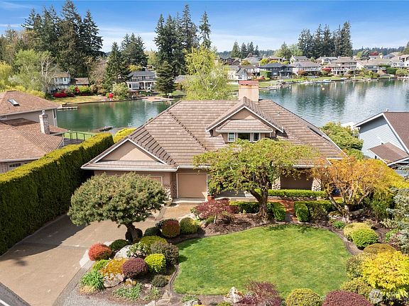 Exceptional Tapps Island western exposure waterfront home located in protected cove w/breathtaking sunsets & views. Step inside the grand entry with soaring 20-foot vaulted ceilings & open-concept living. Wall of windows floods w/natural light, showcasing stunning lake views. Gourmet kitchen is a chef’s dream, perfect for entertaining with top-of-the-line appliances & ample counter space. Main level boasts spacious primary suite, offering a private retreat w/luxurious amenities including jetted tub & sauna/steam shower. Lower level ideal for entertaining, featuring a wet bar in the family room, 3 add’l bedrooms, office + ample bathrooms. Covered outdoor living, pristine landscape, level yard & no-bank waterfront w/covered boat lift, 2 docks