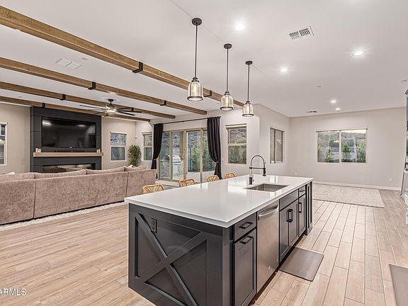 LUXURY meets desert serenity in this newer-construction showpiece in Sereno. New saltwater pool/spa/firepit & built-in BBQ, w/expansive travertine, artificial turf & covered patio w/motorized shade. $250K in post purchase upgrades. The premier ''Olive'' floor plan has 5 beds + Flex Room + 3.5 baths. Features an OVERSIZED 3 car garage w/LED lighting, epoxy floors, & paver driveway. Exposed beams, custom high-end barn doors, modern lighting, wood-like tile, electric fireplace, multi-sliding doors for indoor/outdoor living. The gourmet kitchen features SS appliances, including a Viking fridge, quartz counters, shaker cabinetry, subway tile, & huge walk-in pantry w/coffee bar+wine cooler. The main retreat features dual closets, spa-style bath. All guest rooms include oversized walk-in closets There's MORE! HUGE walk-in pantry (almost as big as a bedroom) with a coffee bar & wine cooler! For added functionality, the cozy Den/Bonus/Flex can be an office or playroom. The lavish main bedroom has a double-door barn doors that open to the ensuite with two separated "His and Her" vanities & dual custom built out walk-in closets, all 4 extra bedrooms have oversized walk-in closets. Laundry room featuring custom built out cabinetry & space for a fridge. A true entertainer's yard awaits with the sparkling resort style pool/spa. This backyard privacy with complete desertscape cactus, & mountain views is rare! Promising year-round enjoyment with the built-in BBQ, gas fire pit, extensive travertine, synthetic lawn, covered patio w/motorized shade, and a sparkling SALTWATER pool & spa installed 5/2025. PLUS! Take advantage of the Community amenities including: a playground, park, BBQ & picnic areas, well-maintained common areas, & scenic walking trails. What's not to like? Don't build NEW. Don't spend the extra thousands on upgrades when you can have NEW NOW with ZERO "build" wait times. This home is 'lightly lived in' BUT HIGHLY UPGRADED to 'The NINES.' It's a showstopper featuring all today's trick, modernistic, trendy, & simplistic vibes! It's not a 10/10; rather it's a 20/20! Come see for yourself~