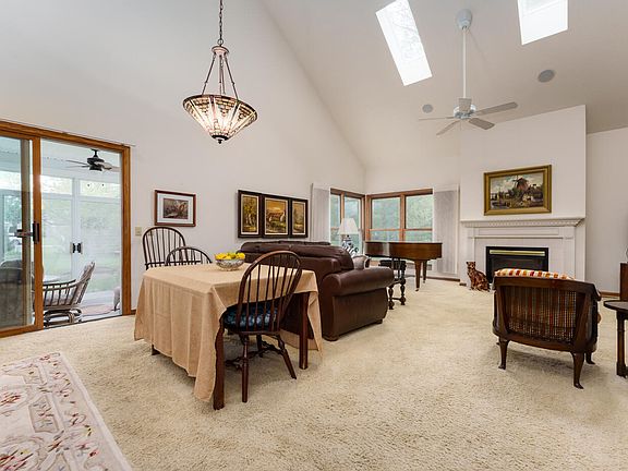 Oversized contemporary condo is the largest in the Hunters Place complex. Special features include solid wood doors, professionally installed speaker system throughout, handicap accessible, newer furnace and air conditioner. Spacious living room w/cathedral ceiling, skylights and fireplace is open to kitchen, which includes all appliances, pantry and access to the laundry room. Primary suite w/private bath and walk-in closet. The main level is completed with a TV room/office and a wonderful three season room, also with speakers. Upper level offers a bedroom w/private bath and a loft area w/cabinets. Daylight lower level includes family room, bedroom and a full bath. The unfinished area has numerous storage shelves, newer mechanicals and reverse osmosis system.