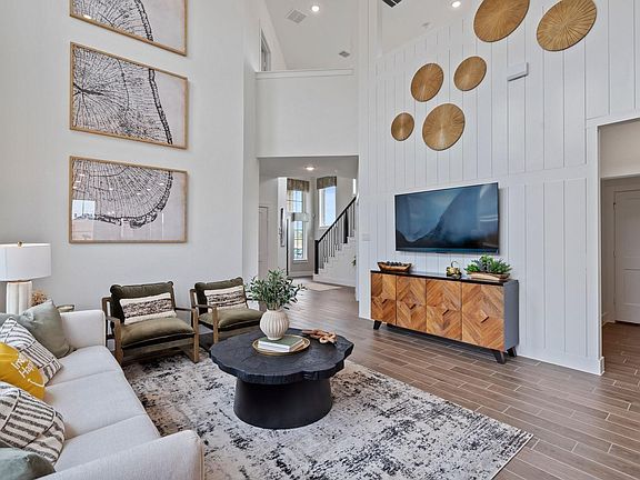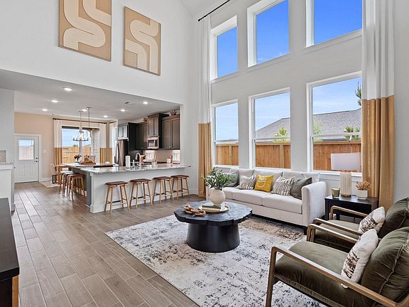 Covered rear patioSoaring two-story family roomUpgraded pendant lightingFull gutters