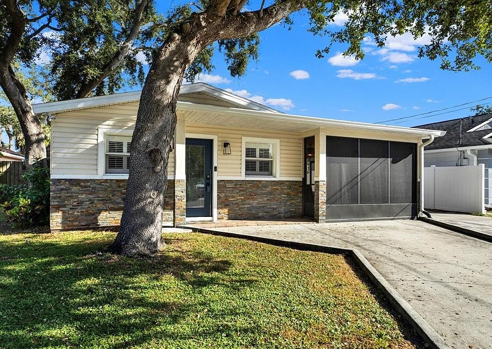 Welcome to 2907 W Wallace Ave—a beautifully updated 2-bedroom, 1-bath, 1,100 sq. ft. single-family home nestled in the Ballast Point area of South Tampa. Built with solid masonry in 1973, this home combines lasting construction with thoughtful, modern upgrades throughout. Importantly, the property sustained no damage from recent storms and sits in Flood Zone X, which means no flood insurance is required—peace of mind and long-term savings for the new owner. Inside, you’ll find a bright, white shaker-style kitchen with granite countertops, soft-close cabinetry, and stainless steel appliances including stove, fridge, microwave, dishwasher, washer, and dryer. The adjacent dining room features espresso finished maple cabinetry and a granite serving bar—perfect for entertaining or working from the integrated office nook. The spacious master suite includes closets and a sitting room with a full wall of built-in bookshelves and private access to the backyard. Stylish touches like plantation shutters, tile and laminate flooring throughout, recessed lighting, and a smart TV/electric fireplace feature wall elevate the living space. The backyard is an entertainer’s dream: large, fenced, landscaped, with a covered lanai featuring a 5-person hot tub, a hardscape fire pit area, and even a modern man-cave/she-shed. The front yard features a separate screened room, double driveways add ample parking. Exterior stone and siding updates (2022), new paint (2024), and a 3-ton AC with updated ductwork (2017 & 2021) round out the home’s smart upgrades. Just minutes from Bayshore, MacDill AFB, with quick access to Downtown Tampa, St. Pete, and Brandon via the Crosstown Expressway. This one checks all the boxes—schedule your showing today!