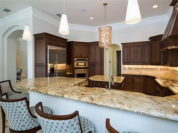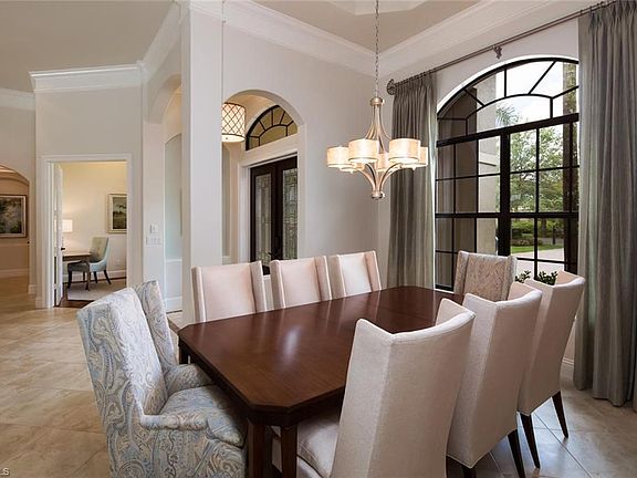 Spectacular home located in the private 12 home community of Amarone! Volume ceilings, wide crown molding, indoor/outdoor sound system, remotely accessed home security & lighting system, French doors and tile flooring are found throughout this home. The foyer opens into a formal living room highlighted by seamless glass windows. Serve special occasion meals in the tasteful formal dining room featuring arched windows, tray ceilings and wide crown molding. Open gourmet kitchen has upgraded stainless steel appliances, custom back splash, rich wood built-ins with granite counters topping the wet bar and under counter wine cooler. The relaxing master suite features his & hers closets, decorative ceiling molding, lush carpeting and disappearing sliders. The master bath offers dual vanities, custom mirrors, large walk in shower with dual shower heads, jetted soaking tub. Enjoy paradise in the covered loggia and summer kitchen or dive into the sparkling tropical pool and spa overlooking the lake through seamless screen enclosure.