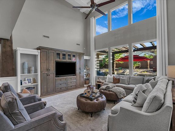 The backyard is a private getaway—saltwater pool and spa, misting system, two patios, putting green, river-rock fireplace, and an outdoor kitchen that makes it easy to relax or entertain. Inside, the home feels warm and welcoming with electric blinds, double ovens, a beverage fridge, granite counters, custom tilework, hardwood floors, and a generous butler's pantry with space for an extra fridge.