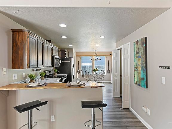 This single level home lives large with thoughtful updates and stylish details throughout. Located in a quiet, no-HOA neighborhood in South Nampa, this 3-bedroom, 1-bath home offers comfort, character, and convenience all in one package. The spacious living room flows seamlessly into the kitchen and eat-in dining space. The kitchen is a standout with a striking wood slab breakfast bar, new quartz looking laminate and freshly stained cabinetry, newer stainless steel appliances and a versatile pantry that is perfect as a coffee bar or appliance garage. The large primary bedroom (13'x11') showcases a designer flair bold wallpaper, mood lighting, and an elegant ceiling fixture. It offers added privacy with its own separate vanity area and a private door to the shared bath. Enjoy the outdoors under the covered patio with no rear neighbors — the home backs to a canal, offering extra peace and privacy. The fully fenced yard is generously sized, with potential for RV access through a simple gate modification.