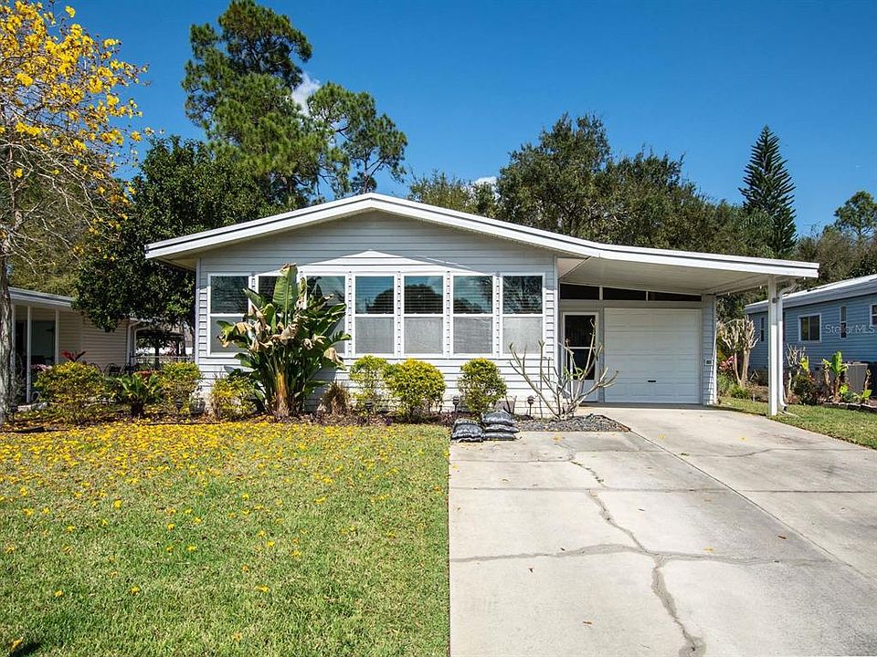 This meticulously maintained two bedroom 2 baths, one-car garage home in the highly sought-after community of Fox Run has been tastefully updated over the last several years. The open and airy feel you experience as you walk into the home is enhanced by the cathedral ceilings and skylights, you note the laminate flooring throughout the living areas as well as the view from the front Florida Room and rear enclosed porch. The home is accented throughout with crown molding, window dressings, and blinds all adding to the warmth of this home. Just a few of the upgrades include stainless appliances and stone countertops, and cabinet accents; the bathrooms have also been updated with cabinet accents and sinks. The double-size driveway leads to the 12 x 30 single-car garage, a great place to keep your boat or that special vehicle, suited for your golf cart charging. To the rear of the garage is a large workshop /storage with access to the rear of the property. The shaded garden area off the back porch is a great place to enjoy. Fox Run's clubhouse is the focal point of social activity, along with a fitness center, two pools, and a boat ramp all for an HOA fee of $60.00 per month.