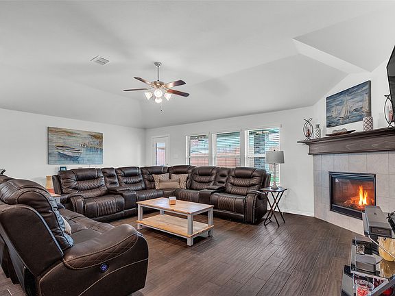 Skip the drudgery in the summer heat and treat yourself to an established lawn and landscape, featuring a tall privacy fence that rests on a beautiful stone foundation. This spacious move-in-ready 3-2-2 home welcomes you with an inviting sitting porch and a beautiful custom wood and wrought iron front door. Just inside is a private space for an entry storage-drop center. Tall ceilings and great lighting enhance the spacious interior and low maintenance wood-look tile flooring flows throughout the Open Plan. The huge open concept living area features a natural gas fireplace, lots of natural light and access to the inviting covered back porch. A dream kitchen has miles of granite countertops with a breakfast bar, tons of cabinets, stainless appliances and farm sink, a walk-in pantry plus a separate dining area. The split Primary Bedroom has a luxurious ensuite bath that enjoys dual sinks, separate shower and garden tub and a spacious walk-in closet. Two additional bedrooms share a bathroom and both have large closets and plenty of natural light. The separate laundry room has ample cabinetry and space for a full-size washer and dryer. Situated in a Heartland master planned community, the HOA offers breathtaking amenities which include walking and biking trails, parks, a lake with a fishing pier, playgrounds and a gym. Conveniently located near shopping, dining and major highways, Heartland also enjoys a highly sought after school system.