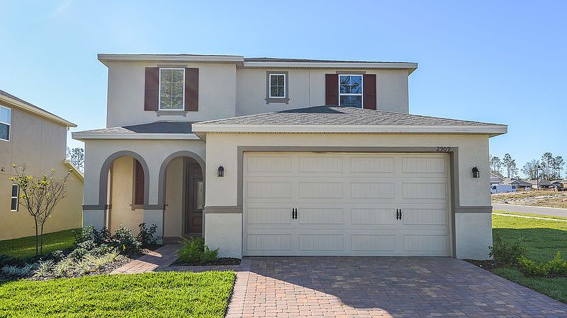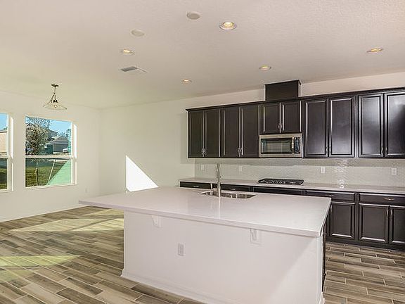 The Weston at Arden Park is a two-story home with four beds, four baths, and a two-car garage. This home offers an open floor plan with great room, dining room (optional den), kitchen, and casual dining area. Both the great room and casual dining area off of the kitchen feature large sliding glass doors that lead onto a paved lanai. The kitchen features dark-finished cabinets, counter tops with tile backsplash, an island with flow-through bar top, and modern stainless steel appliances (including a double oven). The second floor of this home includes a loft that can serve as a media room or playroom. Notice the oversized shower with beautiful glass doors in the master bath.