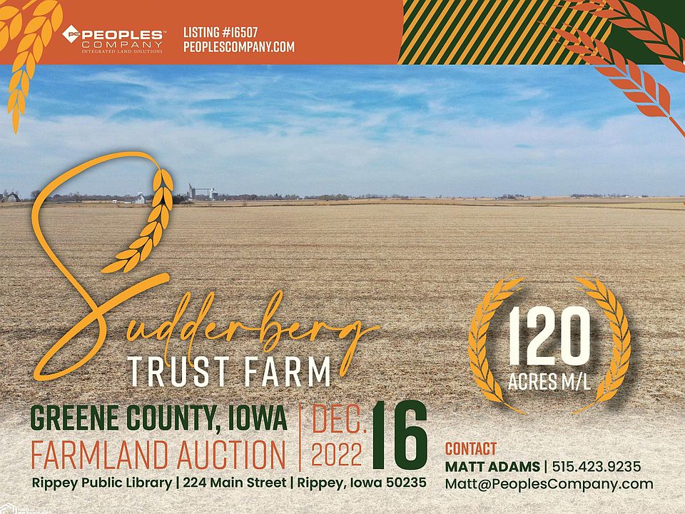 Greene County, Iowa Farmland Auction – Mark your calendar for Friday, December 16th, 2022! Peoples Company is pleased to represent the Sudderberg Trust in the sale of 120 total acres m/l of prime Greene County, Iowa farmland. Located only 1.50 miles east of Rippey, Iowa on the north side of paved County Highway E57 / 290th Street, this nearly 100% tillable farm includes 117.16 FSA NHEL cropland acres carrying above county-average CSR2 soil ratings of 87.3 (compared to the Greene County CSR2 average of 61.4). The farmland soils on this tract consist of Canisteo clay loam, Clarion loam, and Nicollet loam with over 96% of the soils carrying CSR2 ratings above 85. Additionally, the farm has recently been used to produce seed corn. The single tract will be offered on a price per acre basis via Public Auction and will take place on December 16th, 2022 at 10:00 AM at the Rippey Public Library in Rippey, Iowa. This auction can also be viewed through a Virtual Online Auction option.
