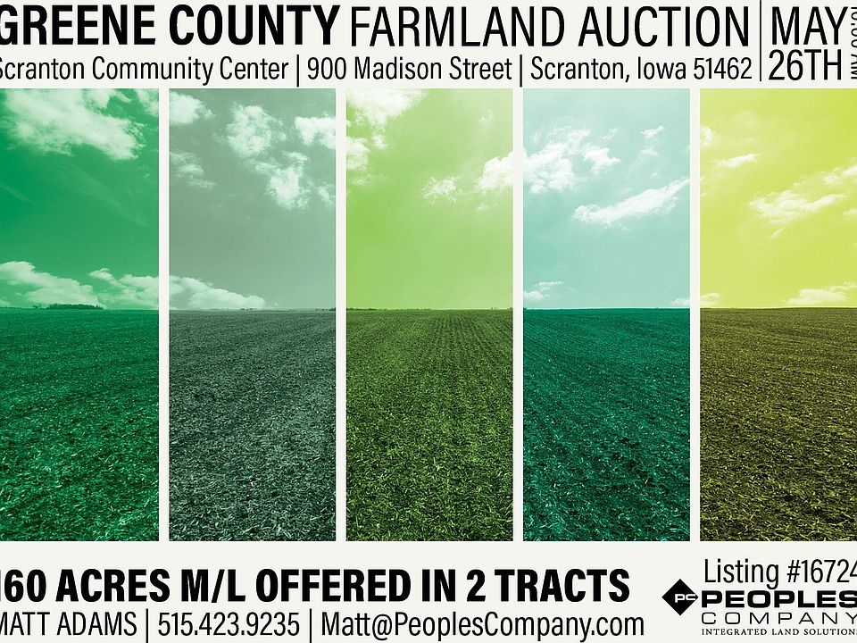 Greene County, Iowa Farmland Auction – Mark your calendar for Friday, May 26th, 2023! I'm pleased to represent the June L. Bowers Irrevocable Trust in the sale of 160 total acres m/l of prime Greene County, Iowa farmland. The farmland is located southeast of Scranton, Iowa at the intersection of paved County Highway E57/290th Street & H Avenue and in Section 7 of Greenbrier Township. The nearly 100% tillable farm includes 155.95 FSA cropland acres and an above county average CSR2 soil rating of 87.8 (compared to the Greene County average of 78.3). The farmland will be sold as two individual 80 acre tracts through the Buyer’s Choice Auction Method where the High/Winning Bidder can elect to purchase an individual tract or both tracts. Tract 1: 80 Acres M/L with 78.79 tillable acres carrying a CSR2 of 87.9. Tract 2: 80 Acres M/L with 77.16 tillable acres carrying a CSR2 of 87.7. Visit our website for more information regarding this 2 tract Auction!