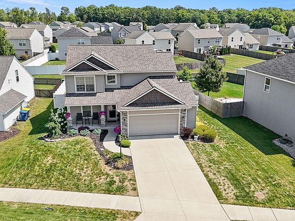 Spectacular craftsman style curb appeal in this Aboite two story with finished lower level! Dutch gable, vinyl shake, complete with stunning custom landscaping. The front porch is the perfect size for a porch swing! The foyer features a two story entry with copious natural light throughout. The modern and functional kitchen is complete with breakfast bar, glass backsplash, stainless steel appliances and large dining area that flows into the spacious family room with new carpet (2025). Walk in laundry room conveniently located next to kitchen with pantry storage shelves. Inviting open staircase leads to large primary en suite ample walk in and dual sinks. Enjoy the second living space in the finished lower level, with professionally installed surround system, home theatre, Epson projector AND 110" screen. Great storage. Sump pump 2025. Massive patio with 6 foot privacy fence 2023!
