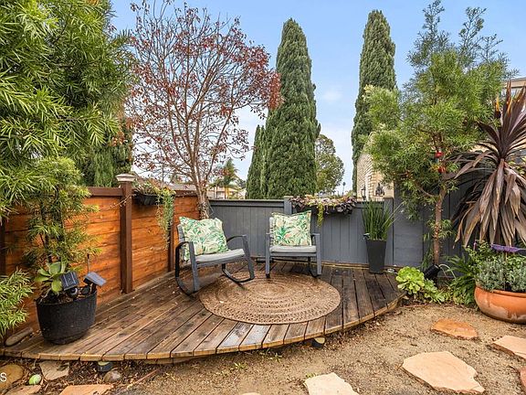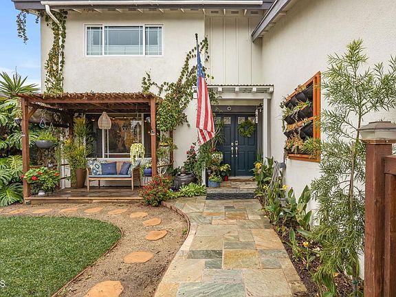 Plant lovers: welcome to your very own Botanical retreat. You can own your very own piece of paradise in the beautiful beach community of Ventura. Located in one of the most sought after neighborhoods in East Ventura, this 4bd + 3 ba home is on a quiet side street and is within walking distance of the award-winning Pointsettia Elementary School. Upon arrival of the enclosed tropical private front yard, you are greeted by a gorgeous Monstera plant. This will delight the gardener and artistic side in anyone that visits. Producing pomegranate, dragon fruit, passion fruit, grapes, red guava, lemons, figs & tangerines are just some of the fruit trees and plants on the property. As you enter the private entertainers backyard you will find an expansive pool that features a newer tile, and copper piping that connects to pumps and pool equipment. Do not miss seeing this beautifully lit pool at night, which is surrounded by a newly cemented patio with flagstone and newer piping going to the pool. The fully covered oversized outdoor kitchen is vented and features a full size sink with hot water tank, a gas BBQ grill and burners a refrigerator, two TVs and ample room to seat a large party. The living room features high ceilings, is light and bright and has an attached dining area. There is a step-down family room that is open to the kitchen and features a fireplace and looks upon the gorgeous backyard. There is a half bath and laundry room that opens to the side yard for convenience to the pool area. Upstairs you will find 4 bedrooms and 2 full baths. An extra wide hallway and double doors leads you to the main suite. The main ensuite bathroom is a nice size and features a beautiful walk-in shower and bluetooth light and fan feature. Island view from bedroom one. Beautiful designer lights and mirrors throughout adds a touch of elegance to this beautiful home. There are storage sheds and a storage chest included in a fenced enclosed area with the pool equipment and upgraded electrical panel. The solar panels are leased and can be assumed by the new owners for use to power the house. This home also features A.C. and central heating. There is a three car garage with two doors, a huge storage loft area with pull down stairs for easy access, and built-in storage cabinets. The garage refrigerator and an upright freezer are included.