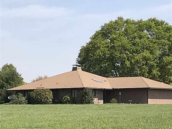 Come see this well built, well kept brick home with 6.4 acres, pool, pool house, double garage and huge oak trees perched on a level yet high knoll! Cathedral beamed ceiling in great room with beautiful stone fireplace and stone wall. Fenced back yard. Wrap around covered porch. Horses welcome.