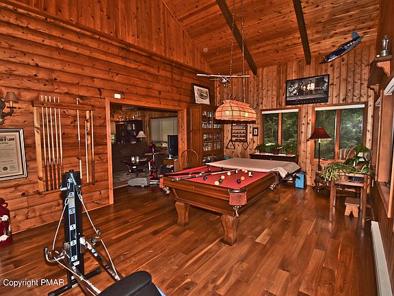 INCREDIBLE CUSTOM 3bd/2ba Log Home PRIVATELY located at the end of a cul-de-sac in a LOW-COST HOA. The OPEN 1st floor features the STUNNING Great Room that has cathedral ceilings, exposed beams, a STONE FIREPLACE, & is open to the lovely Eat-in Kitchen. The charming Kitchen has plenty of cabinet & counter space, stainless steel appliances, & A BUILT-IN PANTRY. The BONUS ENTERTAINMENT ROOM has a pool table surrounded by windows that brings in tons of natural light. This floor also has 2bds, bath, & a mud room w/ laundry. 2nd floor features the Primary Wing w/ a private bd, bath, & a LARGE loft area perfect for a home office or extra living space. This home also has a HUGE COVERED WRAP-AROUND PORCH to enjoy the peaceful neighborhood, 2 car garage, & shed, all sitting on 1+ acres.