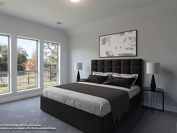 Entry leads to open family room with wall of windows. Kitchen features corner walk-in pantry and generous island with built-in seating space. Dining area set just across from kitchen. Primary suite includes bedroom with wall of windows. Double doors lead to primary bath with dual vanities, corner garden tub, separate glass-enclosed shower and walk-in closet. Home office with French doors set at back entrance. Secondary bedrooms feature walk-in closets. Extended covered backyard patio. Two-car garage.