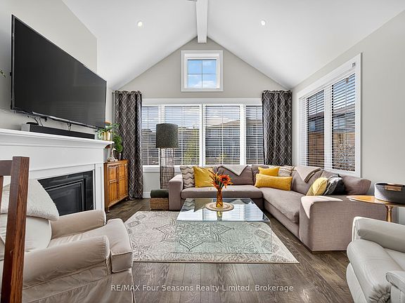 Welcome to 291 Yellow Birch Crescent in the coveted Windfall community, just minutes from Blue Mountain. This stunning 2 + 2 bedroom, 3-bath bungalow sits on a premium 100 frontage lot with captivating hill views, offering the perfect blend of luxury and year-round resort living. Step outside and embrace the outdoors - bike and hike the nearby trails, ski from just outside your doorstep, or swim in Georgian Bay. Residents also enjoy exclusive access to The Shed, Windfalls community hub with pools, hot tubs, and gathering spaces. The professionally landscaped grounds showcase inviting covered porches, a flagstone fire pit, and a hot tub with mountain views. The private, south-facing backyard is drenched in sun and includes green space ideal for children or pets. Inside, the open-concept main level impresses with soaring 14' vaulted ceilings, a gas fireplace, and a stylish kitchen with quartz countertops and stainless steel appliances. The primary suite boasts a spa-inspired ensuite with glass shower and free-standing tub, while main-floor laundry adds everyday convenience. A thoughtfully designed in-law suite, accessible through a private keyless side entrance, features a full kitchen, stainless steel appliances, second gas fireplace, 2 bedrooms, 1 bathroom, and laundry hookups - perfect for extended family or rental potential. Additional highlights include a detached double-car garage, rare 4-car side-by-side driveway parking, and 2,235 sq. ft. of beautifully finished living space. Built in 2018, this move-in-ready home is an exceptional opportunity in one of the areas most sought-after communities.