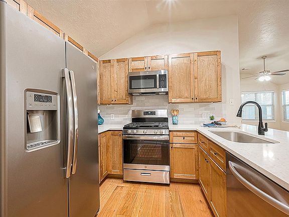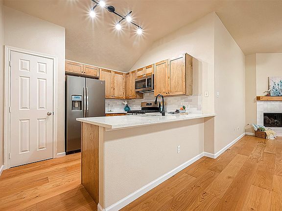 New fireplace surroundHigh ceilingsHardwood flooringUpdated wood cabinetsStainless steel appliancesTile flooringGorgeous quartz countertops