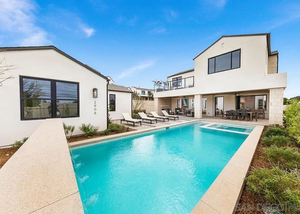 LAST HOME at HIGHLAND 5! This extraordinary Contemporary Coastal home is in a prime location within the exclusive Highland 5 enclave of Olde Carlsbad. This is one of 5 brand new construction homes, thoughtfully designed and built by a local family owned builders CalWest. Upon entering the 2910 Highland Drive you are immediately struck by the opulence of this property from the glistening pool with its fountains and spa, to the beautifully landscaped yard which features a covered loggia with fireplace and a fabulous one bedroomed, self-contained guest house. The home is designed with sophistication and comfort in mind. The floor plan has a natural flow, hardwood flooring which adds a timeless elegance, and it is bathed in abundant light from the oversized sliders to the black framed windows throughout. Designed with family and entertaining in mind the stunning kitchen is at the center of the home. The chef’s kitchen is filled with high-end materials, custom cabinetry, a huge island, Wolf and SubZero appliances. The great room features dining and living rooms with a dramatic fireplace wall. A secondary en suite bedroom/office, powder room and laundry room complete the first floor. Upstairs boasts ocean views, an expansive primary en suite bedroom with large balcony, two secondary bedrooms, 2 full bathrooms, and a large family room. There is plenty of storage throughout the house, and an attached 3-car garage. This home truly has it all and is an opportunity not to be missed.
