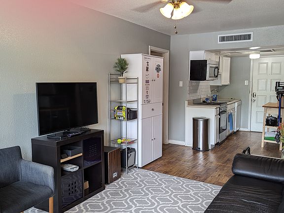 - Operable, screened windows and sliding screened door open onto a private balcony and provide excellent natural lighting to bedrooms and living room.