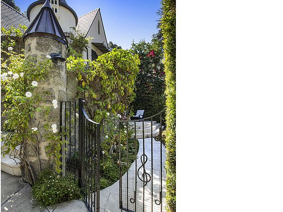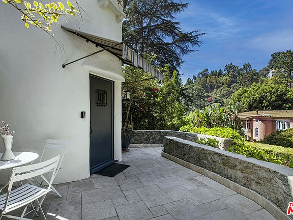 c.1924 John DeLario, ARCHITECT. LEGENDARY chief designer of HOLLYWOODLAND and creator of some of Beachwood Canyon's most iconic residences, including the signature stone entry gates, left his visionary mark on this pedigree French Norman storybook home, as well as on landmarks like Castillo Del Lago, (c.1926) among Southern California's most significant Spanish estates. PRIVATE Entertainment home. 4-bed, 3-bath; formal dining room beneath hand-painted coffered ceilings that open to the canyon, an adjoining living room with sculpted coved ceiling, rich hardwood floors, and striking fireplace, all exemplifies DeLario's craftsmanship where Hollywood romance meets architectural precision. Entertainers home: French doors along the main level flow to the courtyard and terraced lawn, evoking the grace of a petite European villa. A stone patio invites slow afternoons, whether savoring a meal or a book whose pages turn slowly. The classic kitchen pairs connoisseurs' appliances with pretty custom shaker cabinetry. Three boutique-inspired bedrooms occupy private corners of the home, while a fourth suite with a private musical-entry nod and a memorable media room forms a garden-wrapped retreat. Interiors layered by Kathryn Ireland and Brittany Bromley infuse warmth and character throughout, and direct access adds ease. The hand-hewn stone exterior, a signature of DeLario's artistry, endures as a rare and distinguished fragment of Hollywoodland's architectural Beachwood legacy. --Public records show 2550sqft. Vendor measurements are 2760sqft. Buyer to verify.