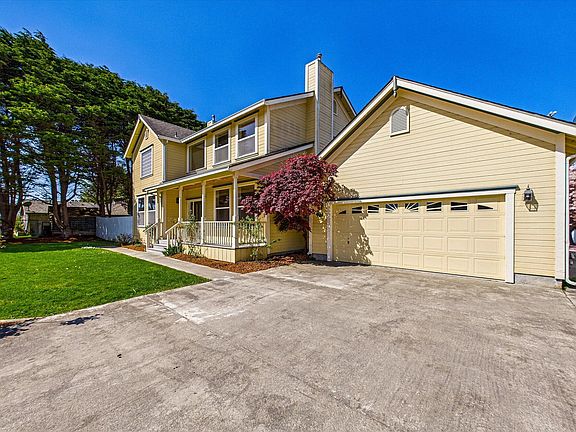 A beautiful, well-maintained sun-filled home on half an acre with ocean views located in a quiet, lovely neighborhood. Oversized windows throughout the home provide an abundance of natural light and take advantage of the ocean and sunset views. Cathedral ceilings and an open floor plan make this 3 bedroom, 2.5 bath home warm, spacious, and inviting. Downstairs features a family room with built-in shelving and a two-sided gas fireplace that opens to a breakfast area and kitchen; kitchen has new Quartz counters top, new gas cooktop, a center island with sink and pantry; sliding glass doors off breakfast area open to the patio and large backyard; formal dining room, and; a well-lit flexible office/library/guest room with gas fireplace. Wood floors recently refinished and new carpet. Upstairs has a large landing with views of the ocean; soaring ceilings in the primary bedroom with in-suite bathroom, two cedar lined walk-in closets, and ocean view; two additional bedrooms, one full bathroom, and storage closet. Oversized garage with built in shelving and a roll-up rear door that allows access to the backyard. Oversized parking on the north side of the home for backyard access, RV, trailer, or boat storage. Situated on half acre of flat, landscaped land and located within two blocks of the ocean, Mad River and a stone's throw from the Hammond Trail. Easy access to highway 101 and the airport makes this home close to everything, yet still private.