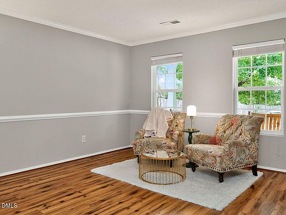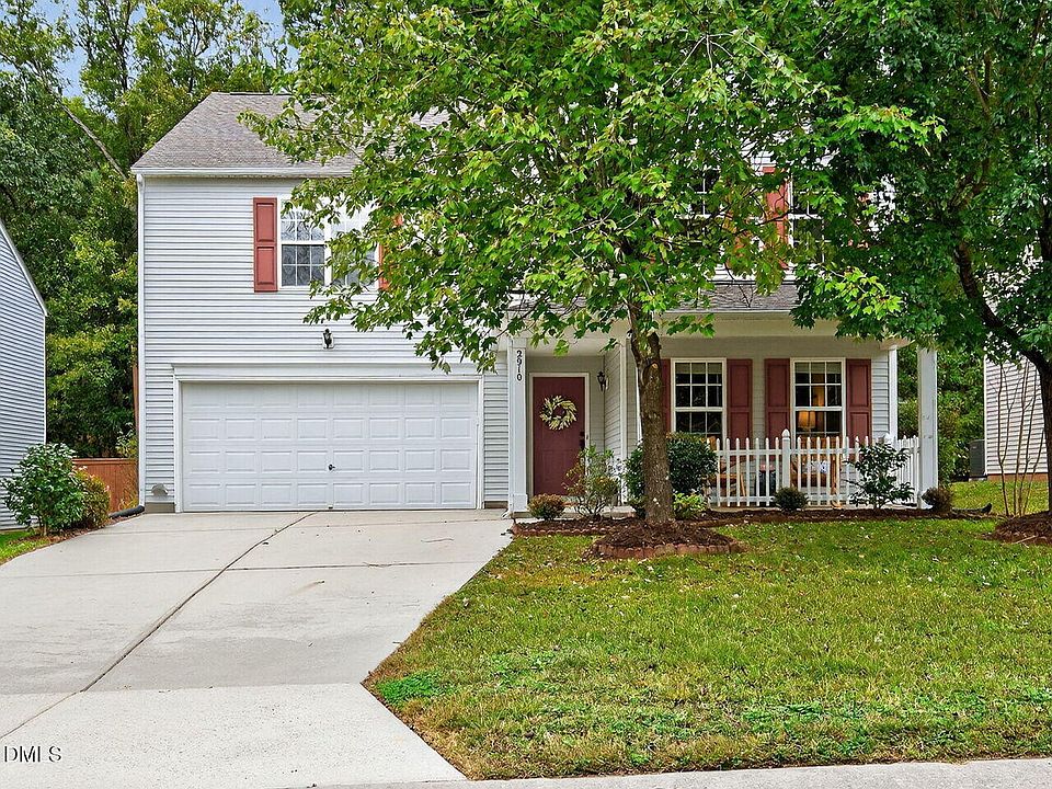 This spacious 2,757 SF home is move-in ready! Freshly painted from top to bottom with beautiful laminate flooring throughout the main downstairs living area. Brand-new carpet upstairs, LVT flooring in the kitchen and laundry room, and new updated light fixtures add a fresh, modern touch. The flexible floor plan features 4 bedrooms and 2.5 baths, including formal living and dining rooms, a cozy family room with gas fireplace, and a bright breakfast nook. The upstairs loft is ideal for a home office or media space. Enjoy peace of mind with a newer roof (2024), newer upstairs HVAC (2022) and upgraded black stainless-steel appliances, including a brand-new gas range, brand-new microwave, and french door style refrigerator. The fenced backyard offers a perfect outdoor retreat with a serene wooded view and oversized patio. Conveniently located near RTP, RDU, Brier Creek, shopping, and dining—this home truly checks all the boxes!