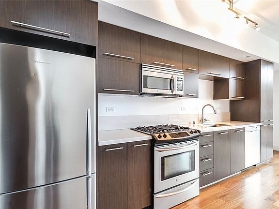 Euro-style cabinetsHardwood floorFloor to ceiling windowsIn-unit laundryStainless-steel appliancesQuartz counters