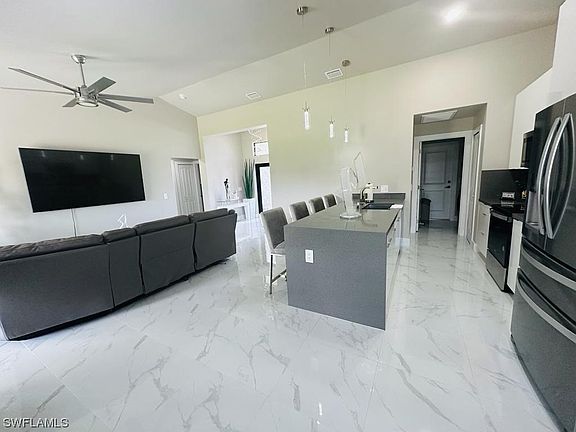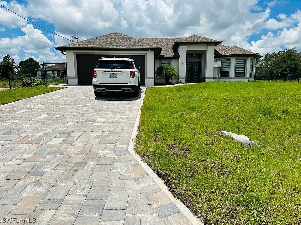 NEW LISTING!!! Seller will contribute up to $5000.00 for closing costs with full price offer. Brand new construction, owner occupied for just 6 months. This home is located in the desirable SW area of Lehigh Acres in a dead end street. Home is loaded with many upgrades and it features 3 bedrooms plus den, 2 baths with 24x24 porcelain tile throughout with an open layout. House comes with 42” wood cabinets with modern acrylic doors and soft closing hinges, quartz countertops in kitchen, bathrooms, laundry and window sills, kitchen stainless steel appliances, spacious master bathroom shower with glass doors, guest bathroom has shower door, zebra curtains, fully outdoor kitchen, terrace, reverse osmosis, cameras, fully fence, small shed, brand new efficiency, sprinklers, pavers on driveway, impact Windows and doors.