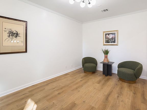 The primary suite is tucked away on the first floor and features crown molding, high ceilings, plantation blinds, and a ceiling fan for added comfort. The ensuite bath offers dual vanities, a garden tub, separate shower, and a generous walk-in closet. Upstairs, a spacious family room is perfect for game or movie nights, complemented by well-sized secondary bedrooms ideal for family or guests.