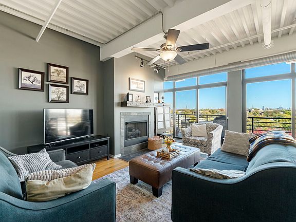 Step into the heart of vibrant Chicago living with this striking 2-bed/2-bath loft nestled in the coveted River Walk/Logan Square/West Bucktown corridor and just a short stroll from the riverfront trail, shops, restaurants and easy access to I-90/94. From the moment you arrive you'll be drawn to the authentic loft character: exposed timber beams, brick accents and a thoughtfully designed floor plan that offers both stylish open living and private retreat spaces. The living/dining area showcases rich hardwood flooring and a cozy gas-log fireplace - the kind of detail that defines loft living. The kitchen offers modern functionality with custom cabinetry, granite countertops and stainless steel appliances, plus a breakfast bar or island that makes entertaining effortless. Adjacent, in-unit laundry adds everyday convenience. The private balcony overlooks the peaceful neighborhood along with a view of Chicago's Skyline, providing a leafy respite from the city's pace. The primary suite features ample closet space and an en-suite bath with double sinks- your own spa-style escape. A second bedroom and full bath complete the smart layout, perfect for guests, a home office or flex space. Garage parking spot, additional storage and bike storage round out the convenience. Plus, the building is dog-friendly and sits right along the river-walk trails, offering kayaking/boat slip potential and a rare blend of city access and natural calm. This location places you steps from the river, blocks to Roscoe Village and Logan Square's dining and nightlife, quick access to the 90/94 and a commuter-friendly zone, yet tucked into a tranquil residential spot. Newer HVAC. Everything is meticulously maintained by the current owner. Don't miss this unique loft opportunity - where industrial charm, modern amenities and unbeatable location all come together!