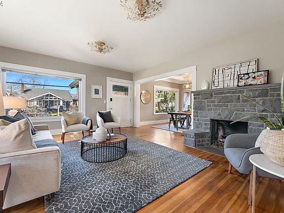 Nestled in the heart of Beaumont-Alameda neighborhood, this 1911 Classic Craftsman boasts timeless original details with practical upgrades. The inviting covered front porch exudes charm and character, complete with a built-in bench & porch swing to sip your morning coffee. Step inside, and you're greeted by a warm and welcoming interior that seamlessly blends vintage details with modern comforts. High ceilings and a great floorplan begins with the spacious living room, original hardwood floors, a cozy stone gas fireplace, and large windows that flood the space with natural light. The adjacent formal dining room with box beam ceilings is perfect for hosting intimate gatherings or lively dinner parties. The expansive kitchen features an island with a range, cabinets with ample storage and optimal counter space. Double French doors lead you out to the backyard space, with a patio to entertain guests or simply a peaceful place to relax, garden, and soak up the sunshine. Upstairs you'll find three bedrooms + an office/flex space + a full bathroom. On the 4th level is additional finished loft space that could be a quiet office, reading room, or playroom. All new carpet on 3rd & 4th floors. The laundry is located in the large unfinished basement where you'll find endless possibilities for customizing to your liking. The long driveway leads to the detached garage, providing convenient parking and additional storage space. Popular Fremont Street is just 3 blocks down the road, enjoy all the restaurants and shopping at your convenience! [Home Energy Score = 1. HES Report at https://rpt.greenbuildingregistry.com/hes/OR10225773]
