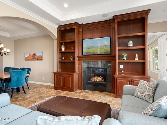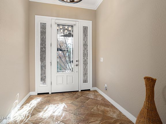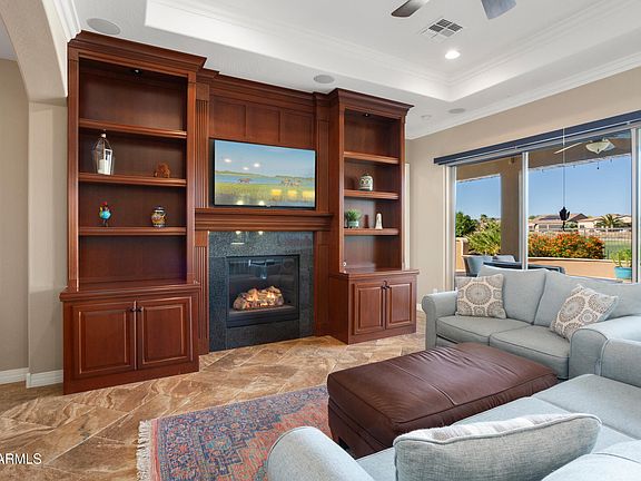 Beautiful executive style 3 bedroom, 2.5 bathroom home perfect for those who want to pamper themselves. Located in the 55+ community of Trilogy at Vistancia, this home sits on the 8th hole of the Trilogy golf course and has its own pool. Before entering this home, you will notice the separate double and single car garages. They both have plenty of built in storage cabinets which are convenient for keeping well organized garages. As you walk toward the front door, you will be soothed by the custom water feature. Once in the front door, the long hallway and high ceilings will draw your attention to the backyard pool and golf course behind it. The backyard, with the custom outdoor barbecue and misters that surround the patio and the soothing sounds of the pool's waterfall, is a perfect place to lounge and entertain. Lanai fold away doors from the family room to the backyard provide a comfortable indoor/outdoor living situation when desired. The family room boasts a large entertainment center built around the fireplace, along with a surround sound speaker system. The large chef's kitchen is open to the living area and centered around the huge upgraded granite island and includes all Jenn Air appliances ( built-in refrigerator, two ovens, 1 built-in microwave, a warming drawer, a gas cooktop stove, and dishwasher). The kitchen has plenty of space for several casual eating areas, and there is even a dedicated space for a more formal dining area on the other side of the family room. All three bedrooms are good sizes. The primary bedroom has plenty of space to enjoy a relaxing evening on a king size bed while watching TV. The bedroom looks out over the backyard and golf course, and has its own large double bathroom (2 vanities, 2 toilet areas, 1 urinal, 1 shower and 1 bathtub) and his and hers walk in closets. The other two bedrooms are conveniently located on the other side of the house. One bedroom is also large enough for a king size bed, and the other bedroom includes a Murphy bed (double), which doubles as a desk when retracted. It's perfect for a home office set up that can easily be converted into a bedroom when guests come to visit. Lastly, just off the garage is a large laundry room with a lot of storage cabinets and drawers, as well as a built-in desk. Washer and dryer are included. Prepaid solar panels and owned water softener. filtration system, central vacuum, electric indoor shades,