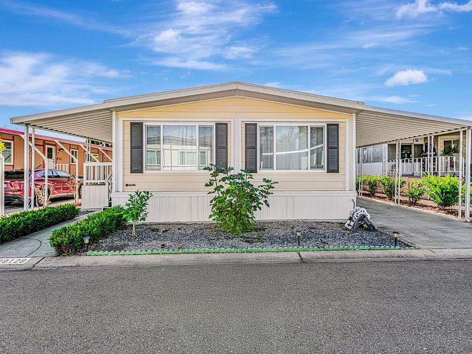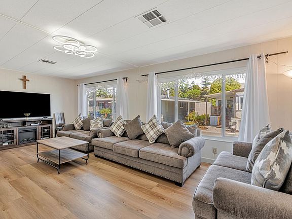 Welcome to this inviting home located in the highly sought-after Spanish Ranch II 55+ community. Offering 2 bedrooms and 2 bathrooms, this home features a large living room flows seamlessly into the dining area, featuring laminate flooring and double pane windows that fill the space with natural light. The kitchen is equipped with matching appliances, including a gas cooktop, built-in oven, and refrigerator, making it a great space for both everyday meals and entertaining. The family room, complete with French doors, opens to an expanded covered porch, providing the perfect setting for indoor-outdoor living. Both bedrooms are a great size with closet space and has a private bathroom. A convenient laundry room with hookups and storage adds practicality to daily living. Additional features include A/C; new roof (2023); new master bath; and new shed
