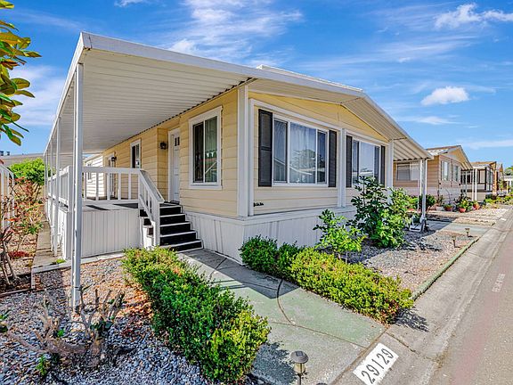 Welcome to this inviting home located in the highly sought-after Spanish Ranch II 55+ community. Offering 2 bedrooms and 2 bathrooms, this home features a large living room flows seamlessly into the dining area, featuring laminate flooring and double pane windows that fill the space with natural light. The kitchen is equipped with matching appliances, including a gas cooktop, built-in oven, and refrigerator, making it a great space for both everyday meals and entertaining. The family room, complete with French doors, opens to an expanded covered porch, providing the perfect setting for indoor-outdoor living. Both bedrooms are a great size with closet space and has a private bathroom. A convenient laundry room with hookups and storage adds practicality to daily living. Additional features include A/C; new roof (2023); new master bath; and new shed. Community is near shopping centers, close to schools, easy access to Hwy 880/92 San Mateo Bridge, 84 Dumbarton Bridge and near Bart Station. Call today for more information! This is a manufactured home on leased land (not real estate); the land lease is $795 per month. 1976 Golden West Serial #: B/A26274 HCD #: DL1164796 *List price excludes closing costs & escrow fees. *All information provided is deemed reliable, but is not guaranteed.