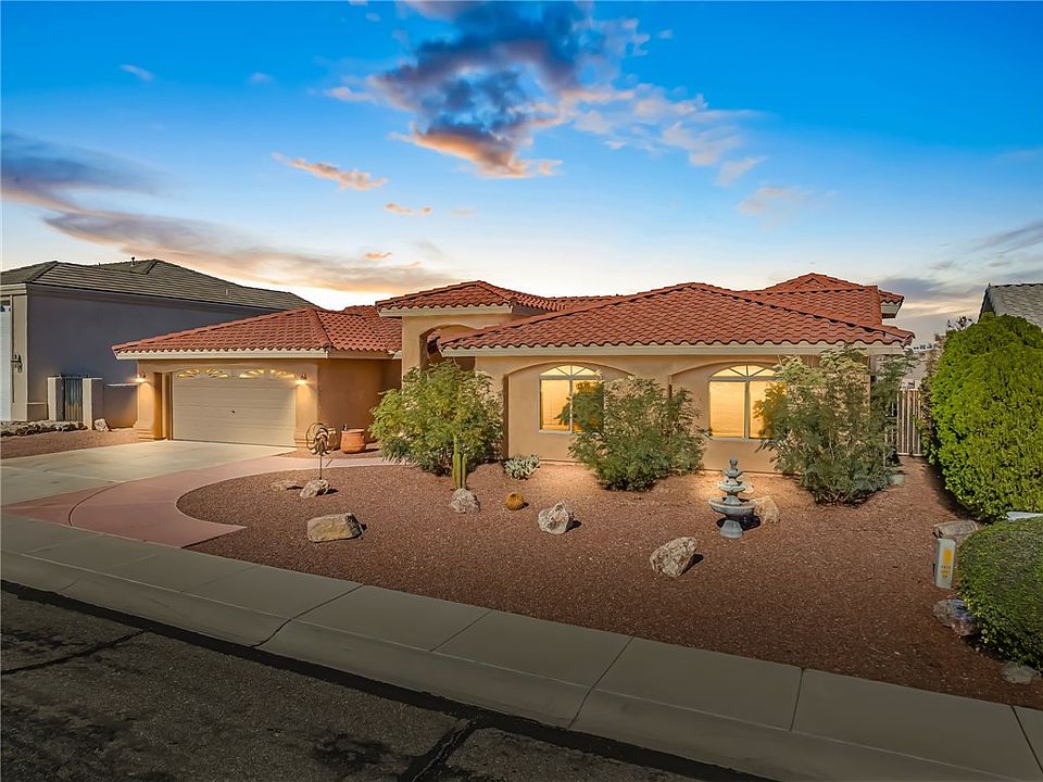 VIEWS! VIEWS!VIEWS! This home sits up on the bluff overlooking the Casino lights of Laughlin Nevada while taking in breathtaking sunsets! Views can be taken in from the living room, dining and master bedroom. Home has split floor plan with french doors from living and master bedroom out to full length covered patio. Master bath has roomy walk in shower and plenty of vanity space. Kitchen is open to the living area and offers plenty of natural light. This home offers pride of ownership in so many ways. With a spanish flair including terra-cotta flooring, dramatic beam ceiling in dining area and beautiful tile work in the baths this home is sure to make you smile. Home offers pride of ownership in so many ways. The following are update to the home within the last few years: Trane A/C heat pump,water softener, ceiling fans, light fixtures, patio roof, front yard sprinkler system, stove, refrigerator, and much more! Landscaping is easy care but still offers plenty of texture and color. Located in the gated community of The Highlands of Desert Foothills, this home should be on your must see list!
