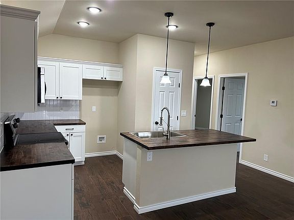 New Construction in North Altus for $159925.00! This patio style home is located on a cul-de-sac lot and has a great open floorplan. Feels much larger than it is with no wasted space. Large open living with kitchen island for dining. Both bathrooms have Subway tile showers and subway tile backsplash in kitchen. The entire house has wood style/look ceramic tile which is prefect for pets, allergies, or renters and easy to maintain. The kitchen has wood butcher block countertops, soft close shaker style cabinets, stainless stove, stainless top control dishwasher, and stainless microwave vent hood. Total electric home with a heat pump and Tankless Water heater that help keep utilities as low as possible. The entire house features bronze hardware and fixtures with Delta faucets. The covered patio is designed to be a covered parking/carport. The double gated side fenced area is designed to be a dog run perfect if you have pets. You also get a Blink camera system and Blink camera doorbell.