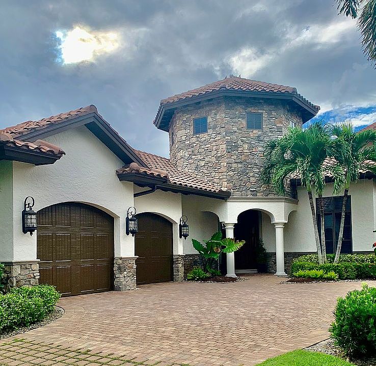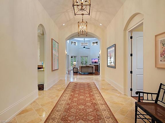 A stunning gallery foyer with barrel ceilings welcomes you to this exceptional residence. An abundance of custom appointments throughout this villa include volume ceilings highlighted by wide crown moldings, impact windows and French doors, plantation shutters, arched passageways, custom built ins, beautiful stone flooring laid on the diagonal, wood flooring & lush carpet. The elegant living room features three sets of French doors opening to the screened lanai allowing the tropical outdoor views to flood the space. Top of the line built in appliances, beautiful wood raised panel cabinetry, under cabinet lighting, custom built in storage with glass display doors, built in wine cooler and granite countertops and center island complete the incredible kitchen. The master suite boasts French doors, expansive walk in closet and quaint seating area overlooking the pool. Dual sinks, custom mirrors, large separate soaking tub and walk in shower with stone accents and multiple shower heads are found in the master bath. Enjoy paradise from the lushly landscaped screened lanai featuring a covered dining and seating areas alongside the heated shimmering pool and cascading spill over spa.