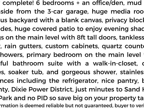 Nearly complete! 6 bedrooms + an office/den, mud bench just inside from the 3-car garage, huge media room/loft, spacious backyard with a blank canvas, privacy block walls on 3 sides, huge covered patio to enjoy evening shade, 10ft ceilings on the main level with 8ft tall doors, tankless water heater, rain gutters, custom cabinets, quartz countertops, tiled showers, primary bedroom on the main level with a beautiful bathroom suite with a walk-in-closet, double vanities, soaker tub, and gorgeous shower, stainless steel appliances including the refrigerator, nice pantry, builder warranty, Dixie Power District. All information is deemed reliable but not guaranteed, buyer to verify all.