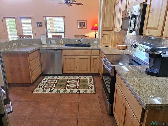 HIGH DESERT PROPERTY. Welcome to this lovingly maintained fully furnished 2 bedroom, 2 bath Santa Fe style home, tucked away at the back of Country Club Estates, a 55+ community. With thoughtful updates throughout and low-maintenance living, this home is truly move-in ready. Over the past several years, the home has received numerous upgrades, including a new washer and dryer, oven, blinds, complete outside stucco, Renewal by Anderson windows and a new roof coating. The HVAC system has been serviced with a new fan motor and Wi-FI thermostat, and the water heater and plumbing fixtures have also been updated.The kitchen offers a large pantry, under and over cabinet lighting, and a cozy dining area – perfect for everyday living or entertaining. The spacious primary suite features saloon doors, a walk-in closet, and a private bath.Enjoy New Mexico living outdoors with a covered patio off of the living room and primary bedroom, complete with a small outdoor kitchen. An upstairs deck provides beautiful views of the Floridas to the east and town views to the west – ideal for morning coffee or evening sunsets. The landscaped yard is attractive and easy to maintain, and the home includes a two-car attached garage. A welcoming front patio adds even more outdoor space. This is a clean, well-cared for home at a great price – perfect for relaxed desert living.