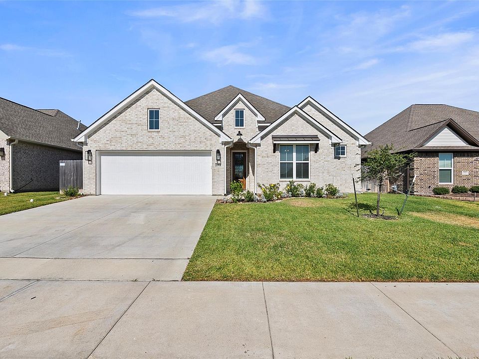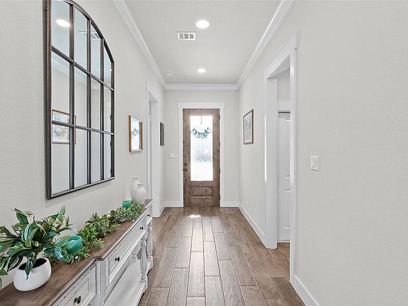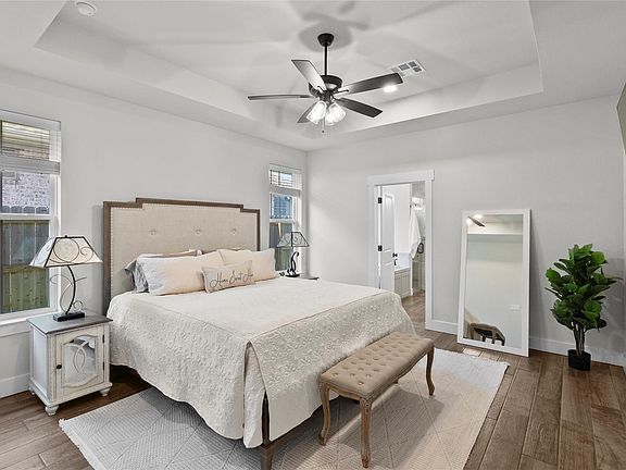 Step inside to an inviting open floor plan that seamlessly connects living spaces, highlighted by wood-look tile flooring that exudes warmth and elegance. The heart of the home is the gourmet kitchen, featuring an oversized island, sleek stainless steel appliances, and stunning quartz countertops. A dedicated study offers the perfect space for remote work or relaxation. The expansive primary suite invites you to unwind with its large walk-in shower, soothing soaking tub, and ample storage. Tall ceilings throughout the home enhance the feeling of spaciousness, while abundant natural light creates a bright and airy atmosphere. Cozy up to the gas fireplace on cooler evenings, creating an atmosphere of comfort and luxury. Outdoor living is a breeze with a fully equipped kitchen featuring a built-in grill. The covered back porch is adorned with a tongue and groove ceiling, coated concrete floors, recessed lighting, and ceiling fans.