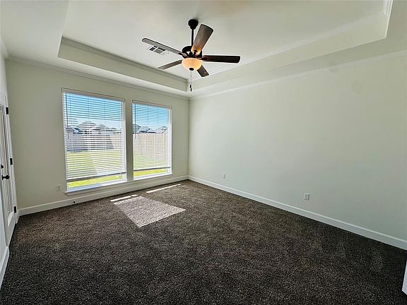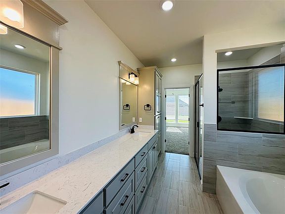 The open-concept kitchen features an oversized quartz island, ceiling-height cabinetry, and plenty of space for entertaining and everyday living. Thoughtful details include a Jack-and-Jill bath, 3-car garage, storm shelter, covered back patio, fence, sprinkler system, and blinds throughout—making this home truly move-in ready.