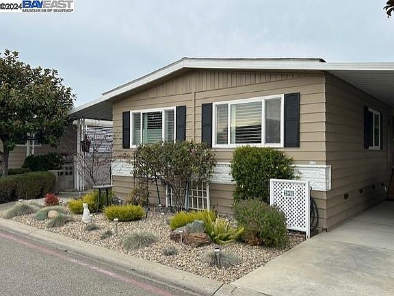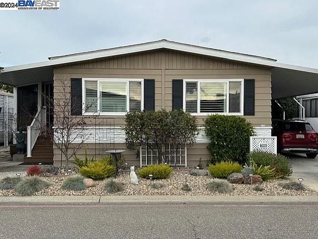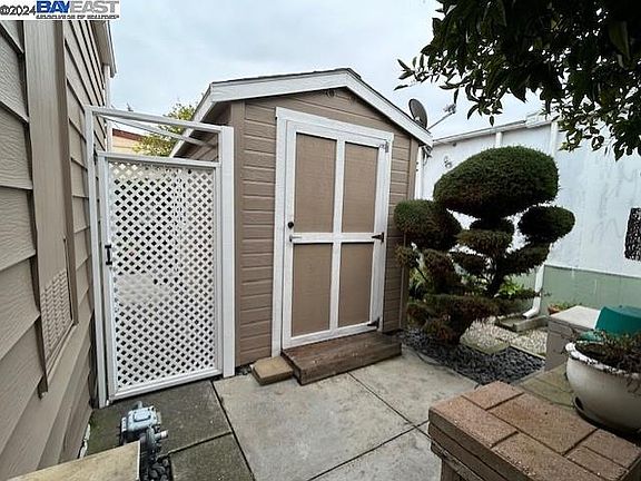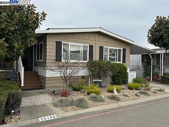 Mobile home Spanish Ranch 2. This home has: 2 bedrooms; 2 full baths; separate living and family rooms; dining area with built in hutch; kitchen with white cabinets and tile counter tops; laminate flooring in family room, living room, kitchen & hall; spacious primary bedroom with private bath; indoor laundry room with washer and dryer included; AC unit, storage shed & more