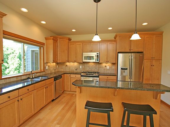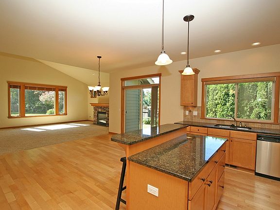 Rambler with curb appeal plus in peaceful neighborhood cul-de-sac of Bellingham. Superbly maintained and exquisitely landscaped. Design/Build by Paul Taylor Homes. 9-foot high and vaulted ceilings. 3 BR, 2 BA with office/den. Like new with granite, hardwood, tile finishes. Open kitchen floor plan with eating bar and dining room access is immediate. Back patio of aggregate stone. Large stone and wood mantle with gas fireplace. More gardening opportunities with raised beds and garden shed.