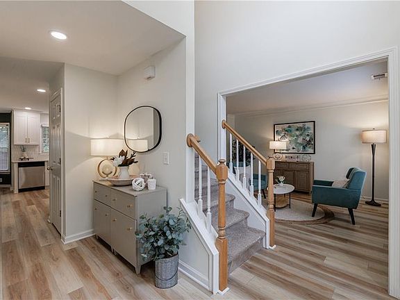 Welcome to this Beautiful and Spacious 4-bedroom 2.5 baths Home in a desirable area in a top ranked school system! Newly painted on Exterior and Interior! Two- story Foyer welcomes you to the Bright and Open concept. LVP flooring and upgrades galore throughout the Main Floor! Chef’s Kitchen boasts upgraded quartz counter tops, new cabinetry with soft close doors, an Island with bar area, and Farmhouse sink. Dining area to hold your next Holiday event and a connected living area to relax and chat after. Breakfast Area to enjoy your morning’s coffee as you enjoy nature from the bay area view of the backyard. Magnificent Two-story Great Room with not only a view to the beautiful and private backyard but also features a beautiful fireplace to warm and welcome any cold wintery day and built in shelving to grab a book to read while enjoying the fire. Primary Bedroom with ample space features hardwoods and a Large Walk-in closet. Primary Bath fully renovated with large Frameless Shower boasting upgraded tiling, new double vanity with soft close feature, free standing soaking Tub, vaulted ceilings and upgraded tile flooring. The hardwood flooring hall leads to 3 very Large secondary bedrooms with ample space for a Guest Room or an Office space. Large Private Backyard is parklike with trees galore and beautiful Zoysia sod. This Lot is Large with neighboring properties out of sight. Side Loaded Garage has been painted from top to bottom featuring epoxied floor coating! The Driveway is double wide with a parking pad to further add to parking space! Community is quiet and well-kept featuring a pool and volley ball area. Conveniently located to the Highway (I-85) for a quick(er) commute to the City, schools, grocery, restaurants. Great area in a top ranked school system!