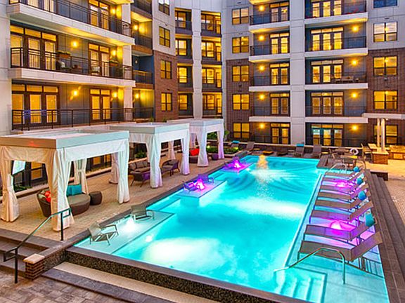 Stunning views of Downtown & Galleria, Penthouse Homes Available, Infinity edge pool with cabanas & lounge seating, Covered outdoor kitchen & TVs, Resident business center with Mac computers and wireless printing.