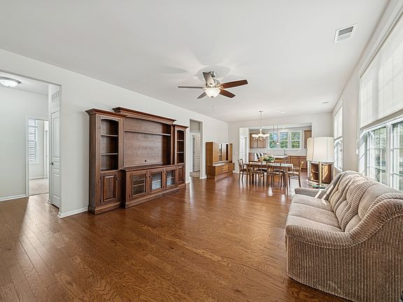 Edgewater by Del Webb* Hard-to-Find PASSPORT Model built in 2015! This model has 2 bedrooms, 2 bath, den, and extra space in 2 car garage for storage or a golf cart! "Premium Lot" with vacant lot with trees and a park behind! WOW! Home is only 10 years "young" so house is working well.Hardwood floors everywhere except bedrooms. Kitchen has granite counters, large island, tall kitchen cabinets, soft close drawers, and a double pantry. Utility room has full size stackable washer and dryer and utility sink. Master bath has two sinks, shower with seat, and linen closet. Quick close possible. Visit Lodge and see the indoor pool, hot tub, outdoor pool, fitness center, billiards room, library, and so much more. Edgewater also takes care of grass and snow and seal coats drive and mulchs beds every other year!This is an Active Adult Community and one resident in home must be at least 55!