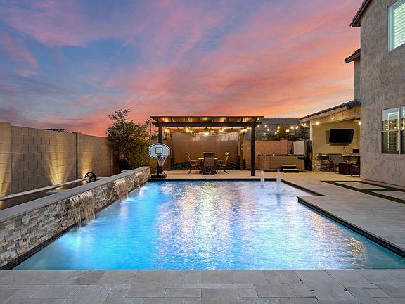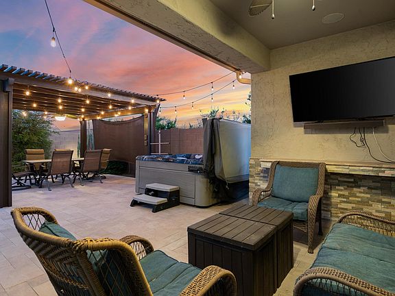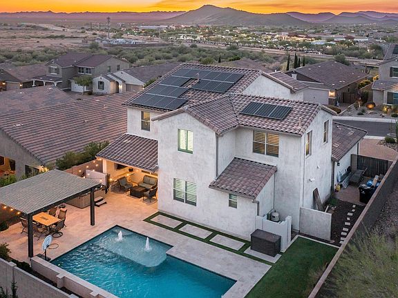 Perched on a premium hillside lot w/ sweeping mountain, city light & sunset views, this expanded 5-bed, 4-bath Meritage home features a flexible layout with a loft / game room and a pocket workspace / home office off the kitchen. The newly added shower to the main floor powder room enhances function & flexibility creating the option of a 1st floor suite. Enjoy a chef-worthy kitchen, w/gas cook top & multiple ovens. Desirable wood-look tile floors & spacious bedrooms, each offering stunning vistas. VERY RARE extended length 3.5 car tandem garage measures 47' deep! Once outside, soak in Arizona's best weather all year 'round with a sparkling heated pool and unforgettable sunsets. Save $$$ with the leased Solar System! Close to TSMC, Fry's Grocery, and easy access to I-17 Hwy. Welcome Home!