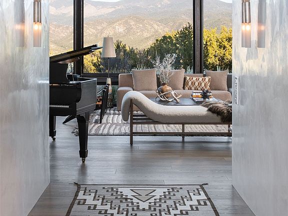 Experience the pinnacle of luxury living in this stunning 4-bedroom, 3.5-bath home, including an 878 sq. ft. guesthouse. Situated within the esteemed Monte Sereno community, this award-winning residence, designed by architect Robert Zachry and builder Scott Wong of Solterra, captures the essence of modern elegance. Perched on one of the highest lots in the community, with a private, gated entrance, enjoy 270-degree unobstructed views of the Sangre de Cristo Mountains, the Badlands, Ortiz/Sandia Mountains, and the twinkling lights of Santa Fe. This single-level home has recently been thoughtfully reimagined by designer Mary Clark with luxury finishes throughout. The flow from the living room to the dining area, kitchen, and outdoor portals creates an inviting atmosphere. The open kitchen includes custom oak cabinetry, travertine countertops, Gaggenau ovens, Thermador and Miele appliances, as well as a hidden scullery. Luxurious owner’s suite provides privacy, featuring a Swedish wood burning stove, two walk-in closets, exercise room, and an en-suite bath with a travertine wet room, Waterworks soaking tub, Vola faucets and shower for two. Additional highlights include 32 solar panels, a heated driveway and sidewalks and a comprehensive audio system. The in-ground hot tub / plunge pool and outdoor custom kitchen, equipped with a Hestan grill and Alfa gas pizza oven, are ideal for entertaining. Low-water xeriscape landscaping enhances outdoor appeal, while the 2-car garage plus another in the guesthouse adds convenience. Discover unparalleled living in a convenient, close-in location where comfort and sophistication unite.