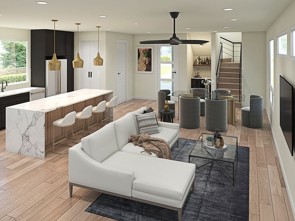This stunning East Austin home welcomes you with an open first floor living space filled with natural light from the expansive windows at the front of the home and sliding glass doors opening to a patio for the perfect place to unwind. The sleek kitchen with a bar nook features gunmetal cabinetry, calacatta counters and waterfall island, zellige backsplash, and Café matte white appliances. The expertly located powder bath has floating matte maple cabinetry, quartz counters, a gorgeous pendant, and an incredible Clay Imports accent wall, with 6.5" oak floors that encompass the entire living space and lead you upstairs. On the second floor of this beautiful home you will find two bedrooms featuring large windows, spacious walk-in closets, and designated bathrooms with matte maple floating cabinetry, calacatta counters, and gorgeous finishes. The third floor makes for a private and beautifully designed owner's suite with gorgeous windows and an ensuite with classic, modern selections that include floating cabinets, calacatta counters, and elevated lighting, plumbing, and tile finishes.