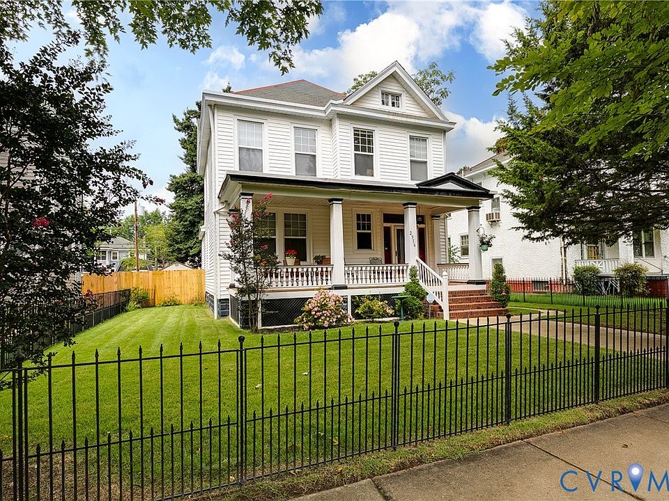 Located in RVA’s beloved Northside, 2916 Montrose Ave is a stunning example of a Colonial Revival–style American Foursquare that blends timeless character with thoughtful updates. From the hipped slate roof to the wide covered front porch with its newer standing seam metal roof, every detail makes a statement. Step inside through the original front door framed by sidelights and a transom to find an inviting foyer highlighted by a gorgeous staircase with two ornate newel posts. Throughout the home you’ll discover gorgeous original hardwood floors, multiple soapstone fireplaces, and classic transom windows that showcase its history. The dining room with fireplace flows seamlessly into a spacious living room, while the updated kitchen impresses with custom cabinetry (soft-close, dovetail construction), a large island with seating, granite counters, pendant and recessed lighting, and stainless steel appliances. A flexible first-floor primary suite (currently used as a home office) features a stylish ensuite with a granite-topped vanity and tile-surround tub/shower. A large laundry room completes the main level. Upstairs, you’ll find four generously sized bedrooms, each with ample closet space, transom windows, and more soapstone fireplaces, plus a full bath with granite vanity and tub/shower with tile surround. Outside, enjoy a large rear deck, spacious yard, new privacy fence, and off-street parking. A partial basement offers great storage, while the more “nuts and bolts” of the home include dual-zone HVAC with backup gas boiler, two water heaters, vinyl windows, and vinyl siding for peace of mind. Best of all, you’re an easy stroll to local favorites like The Smokey Mug, Julio’s Bagels, Slay Burger, and more—making this home the perfect mix of historic charm, modern comfort, and walkable convenience.